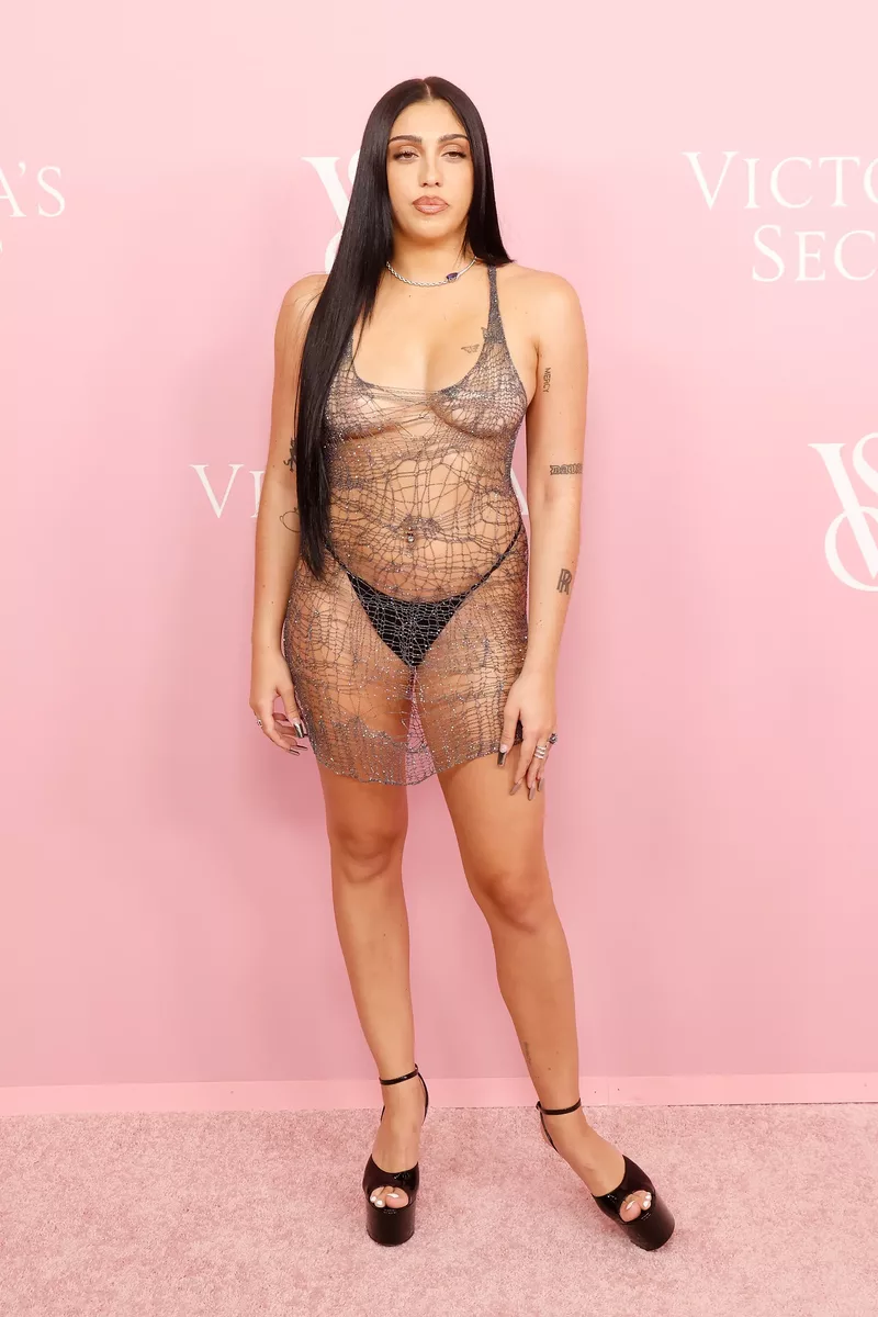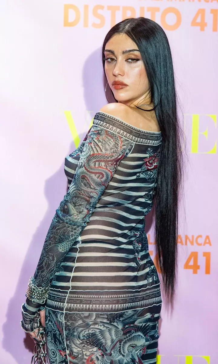 Madonna’s eldest child graced the red carpet in a transparent striped dress adorned with intricate black, white, and red designs. Among the motifs on the dress were dragons, fish, and anchors. The see-through fabric even showcased her black thong underwear.