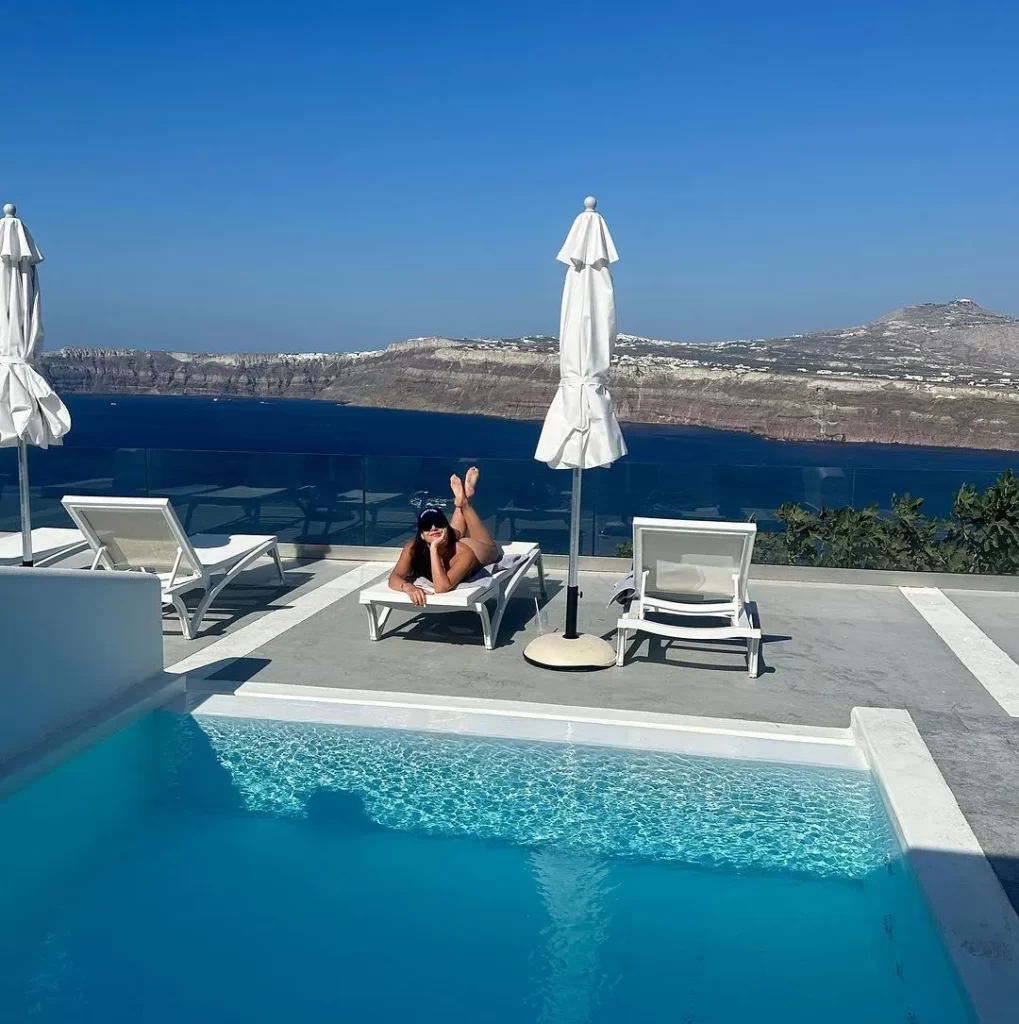 In one photo, she sat on a sun lounger, playfully flipping her brunette hair over her shoulder. The second snap showcased her lying on her front on a towel, flashing a radiant smile against the breathtaking Santorini skyline.