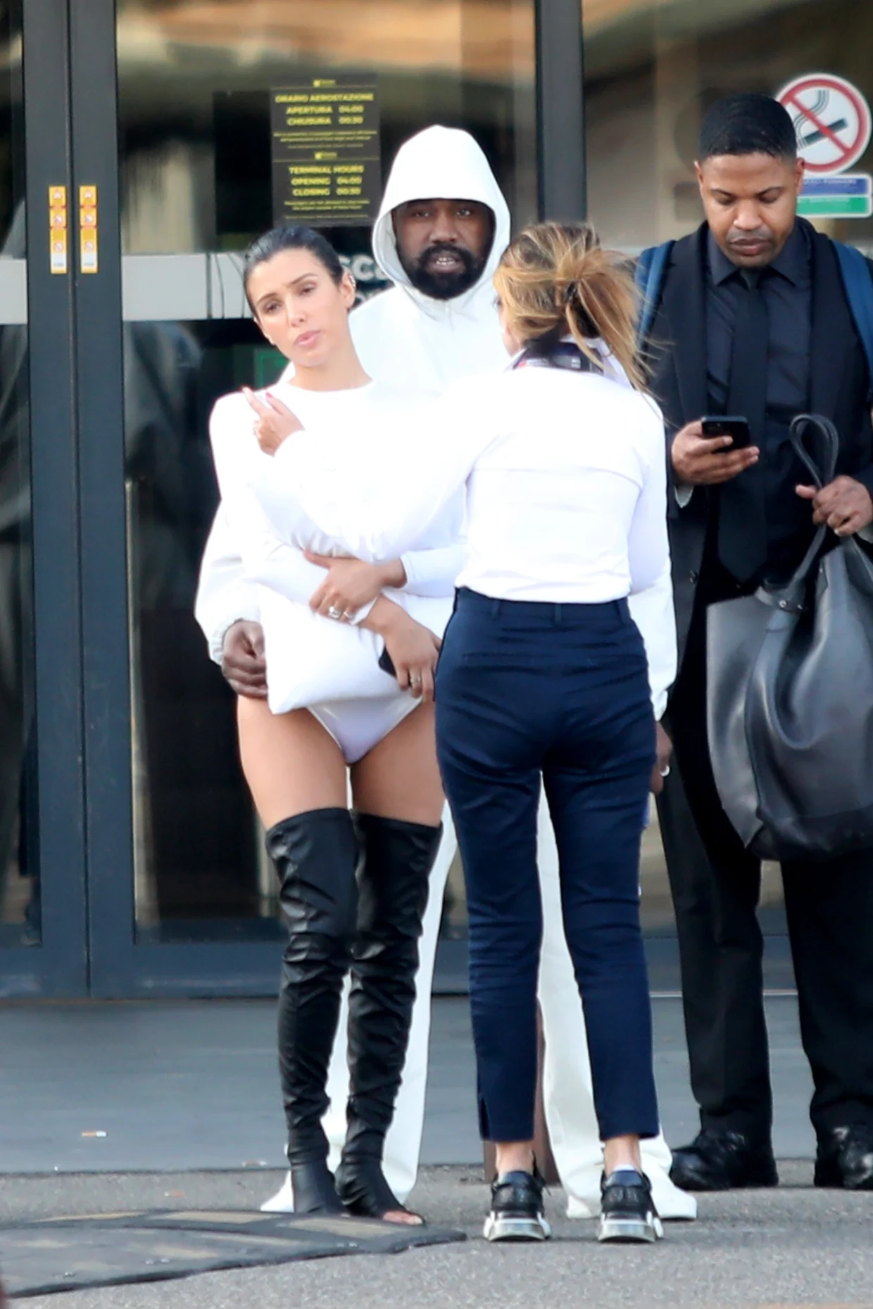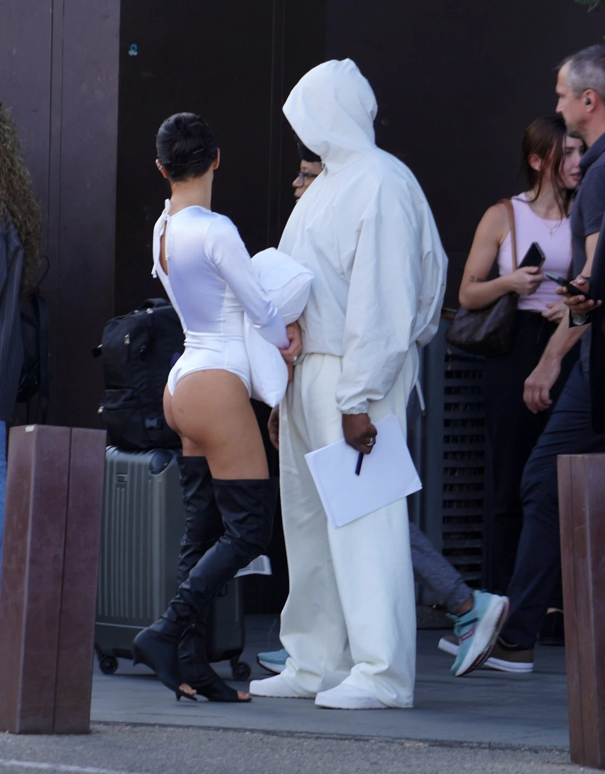In photos obtained by The U.S. Sun, the pair was seen enjoying a sunny day in Florence. Kanye, 46, opted for his signature minimalist look, wearing an all-white ensemble complete with a hooded sweatshirt, matching pants, and shoes. Bianca, 29, on the other hand, went for a more provocative look, flaunting her toned physique in a skintight, long-sleeved thong bodysuit. To complement her outfit, she wore black thigh-high boots and slicked her brunette hair back into a bun, while holding onto a white pillow.