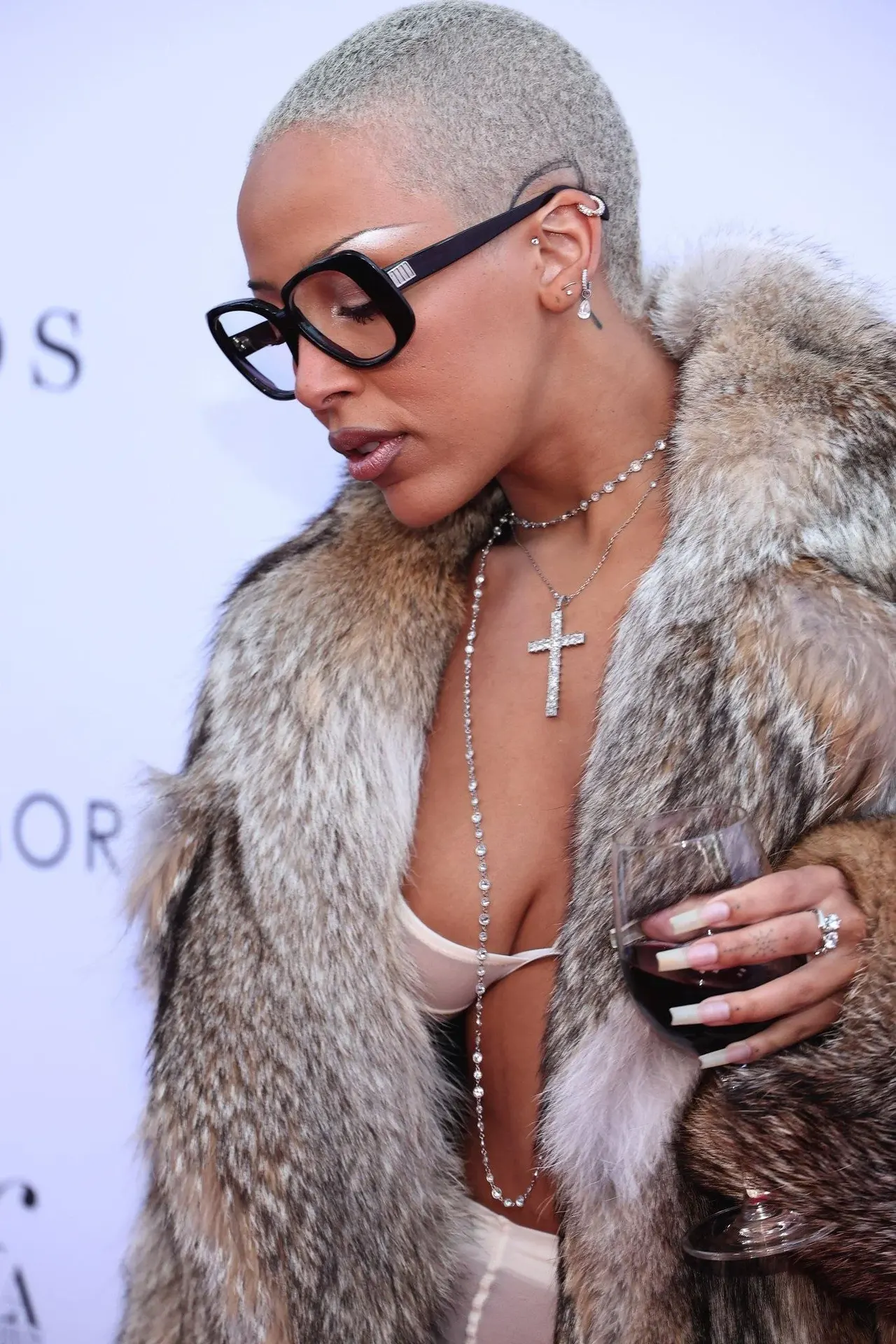 True to her eclectic style, Doja Cat showcased a bold hair transformation, sporting a close-cropped, silvery gray hairstyle that perfectly complemented her edgy aesthetic. Behind oversized, thick-rimmed eyeglasses, her makeup featured metallic silver eyeshadow, rosy blush, and ashy pink lipstick, creating a captivating contrast against her brown eyes.