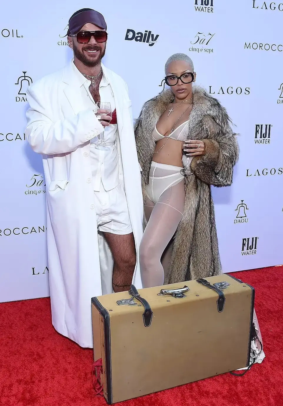 Accompanying Doja Cat on the red carpet was her stylist, Brett Alan Nelson, whose outfit mirrored her avant-garde flair. Dressed in white shirt and boxer shorts, paired with a long white coat and black loafers, Nelson embraced the unconventional spirit of the evening, mirroring Doja Cat’s daring fashion choices.