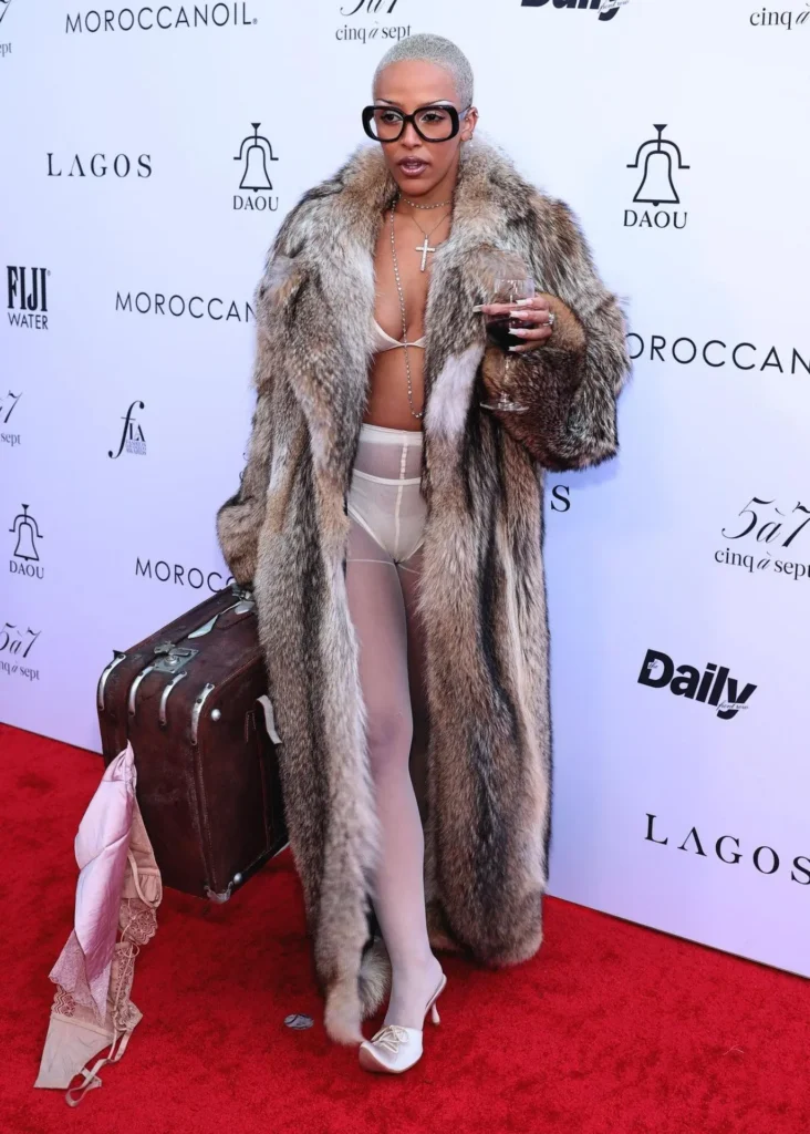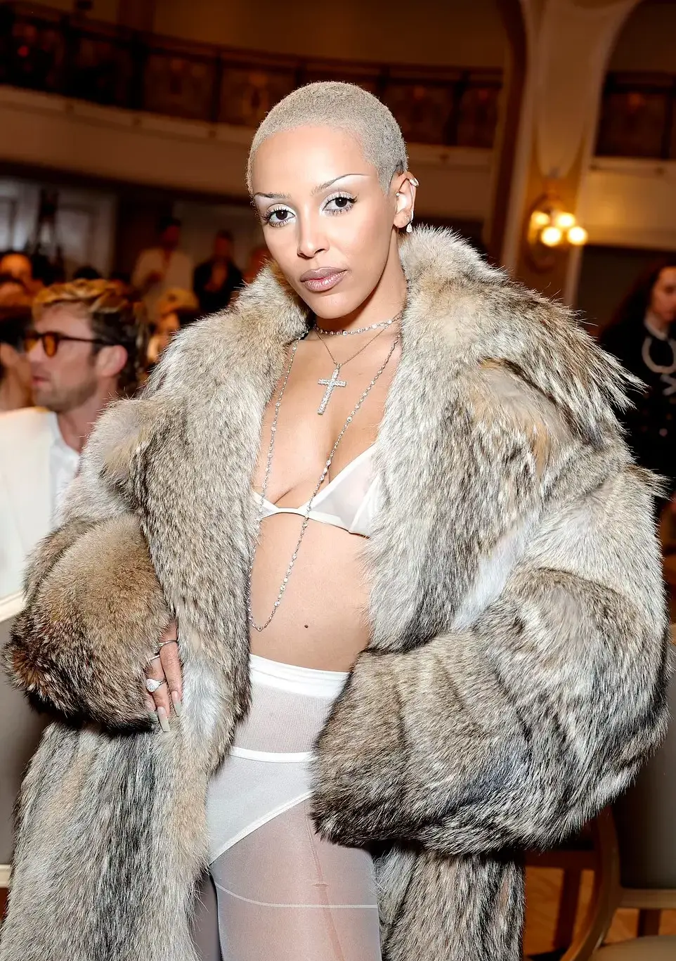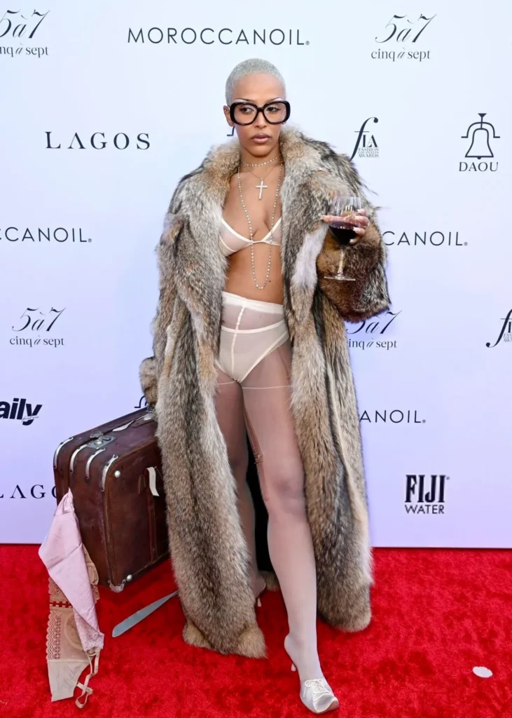 Sporting a sheer ivory bra and matching underwear, Doja Cat left little to the imagination, flashing her cleavage and toned midriff with confidence. Paired with ripped pantyhose and a floor-length brown and cream fur coat, her look exuded both sensuality and extravagance.