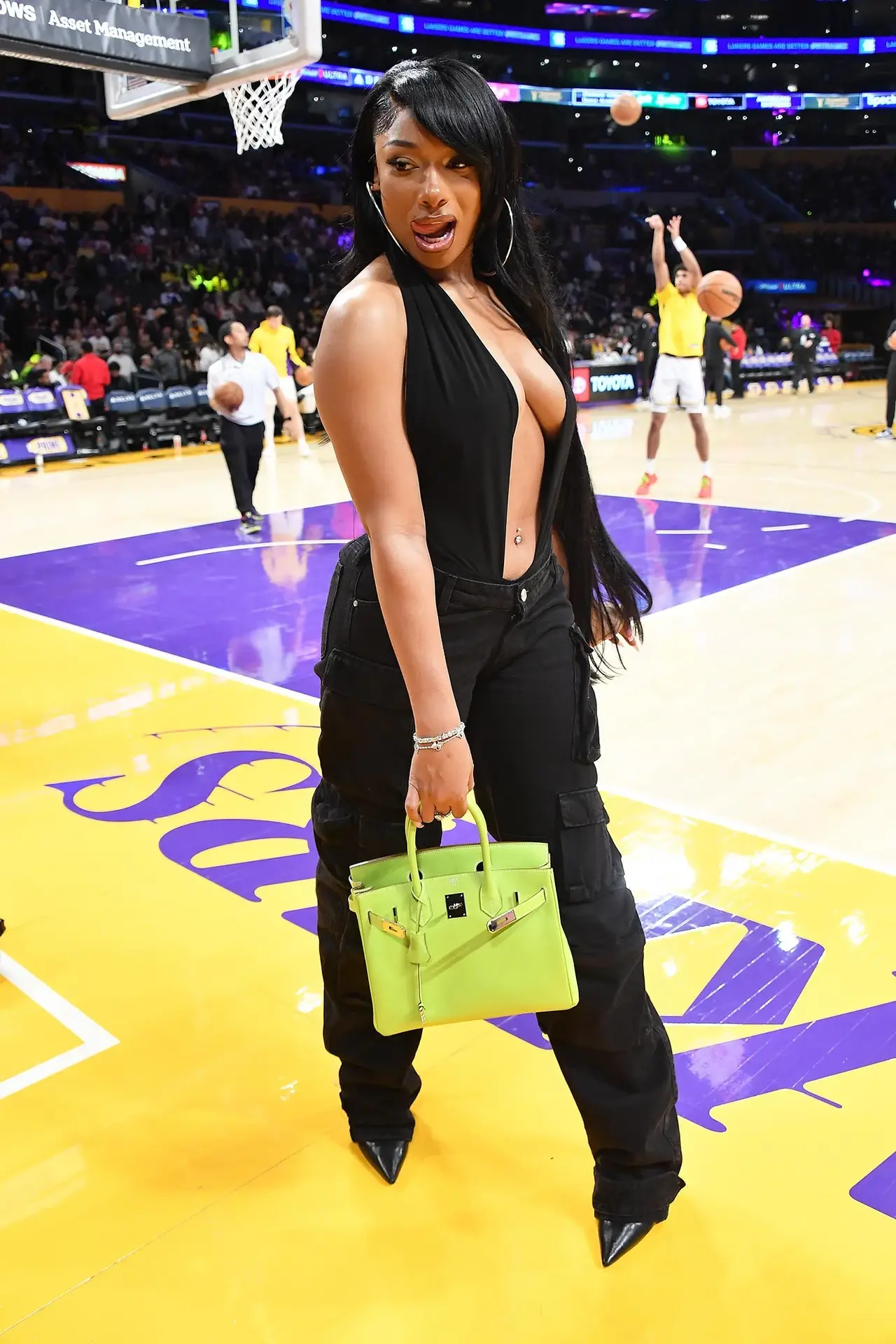 The 29-year-old rapper made a bold fashion statement in a plunging black top paired with sleek cargo pants, accessorized with a striking lime green Hermès Birkin bag worth a whopping $16,500. Completing her look with pointed black heels and oversized hoop earrings, Megan exuded confidence as she flaunted her signature style at the courtside.