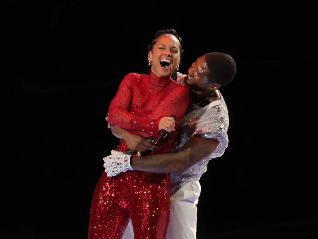 In a dazzling halftime show that left 65,000 fans in awe, Alicia Keys made a surprise appearance on stage with Usher at Super Bowl 58. The iconic duo, known for their 2004 hit “My Boo,” delivered a performance that added a touch of nostalgia to the high-energy spectacle.