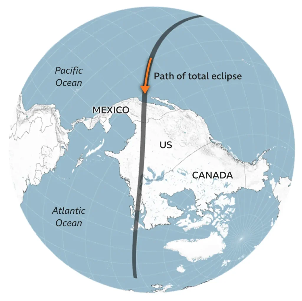 The eclipse will pass through several time zones as it crosses the continent. The Moon’s deep shadow, or umbra, will then race across the Earth’s surface at more than 2,500km/h (1,500mph), crossing the Mexican coast at 18:07 GMT and the Rio Grande border between Mexico and the US at 18:27 GMT. The journey continues up through 13 US states, skimming the Canadian border – with Hamilton at 19:18 GMT and Montreal at 19:26 GMT just inside the totality path – before sweeping out over the provinces of New Brunswick at 19:32 GMT and Newfoundland at 19:39 GMT. The Moon’s umbra will lift off the Earth’s surface in the Atlantic Ocean at 19:55 GMT, about 1,120km (700 miles) west of Normandy, France.