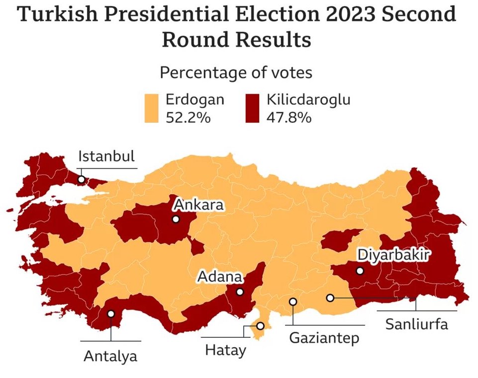 Despite taking Erdogan to a run-off second round for the first time since the direct election of the presidency in 2014, Kilicdaroglu was unable to significantly close the gap, falling over two million votes behind. Erdogan celebrated his victory by addressing supporters atop a bus in Istanbul, followed by an address from his palace balcony to an adoring crowd. He referred to the election as one of the most significant in Turkish history.