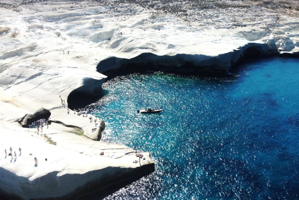Milos Island is famous for its unique geological formations and Sarakiniko Beach showcases the island’s raw beauty. The beach is characterized by its lunar-like landscape, with white volcanic rocks and caves carved by wind and water. Take a leisurely stroll, explore the surreal formations, and enjoy the peaceful ambiance of this extraordinary beach.